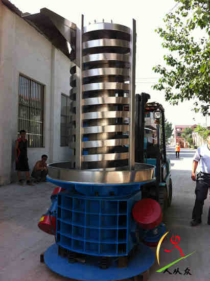 DZC電機振動垂直提升機是由提升槽、振動電機、減振系統(tǒng)和底座等組成。它采用振動電機作為振動源,固定在提升槽上的兩臺相同型號的振動電機中心線交叉一定角度安裝,并做相反方向自同步旋轉(zhuǎn),振動電機所帶的偏心塊在旋轉(zhuǎn)時各個瞬間位置所產(chǎn)生的離心力之分力沿拋擲方向作往復運動,使支承在減振器上的整個機體不停振動,使物料在提升槽內(nèi)被拋起的同時向上運動,物料落入入料槽后,開始被拋起,此時可以使物料與空氣充分接觸,還可以起到散熱冷卻的作用。當垂直輸送機工作時,根據(jù)雙振動電機自同步原理,由振動電機產(chǎn)生激振力,使整個輸送塔體作水平圓運動和向上垂直運動的空間復合振動,螺旋槽內(nèi)的物料則受輸送槽的作用,作勻速拋擲圓運動,沿輸送槽體向上運動,從而完成物料的向上(或向下)輸送作業(yè)。